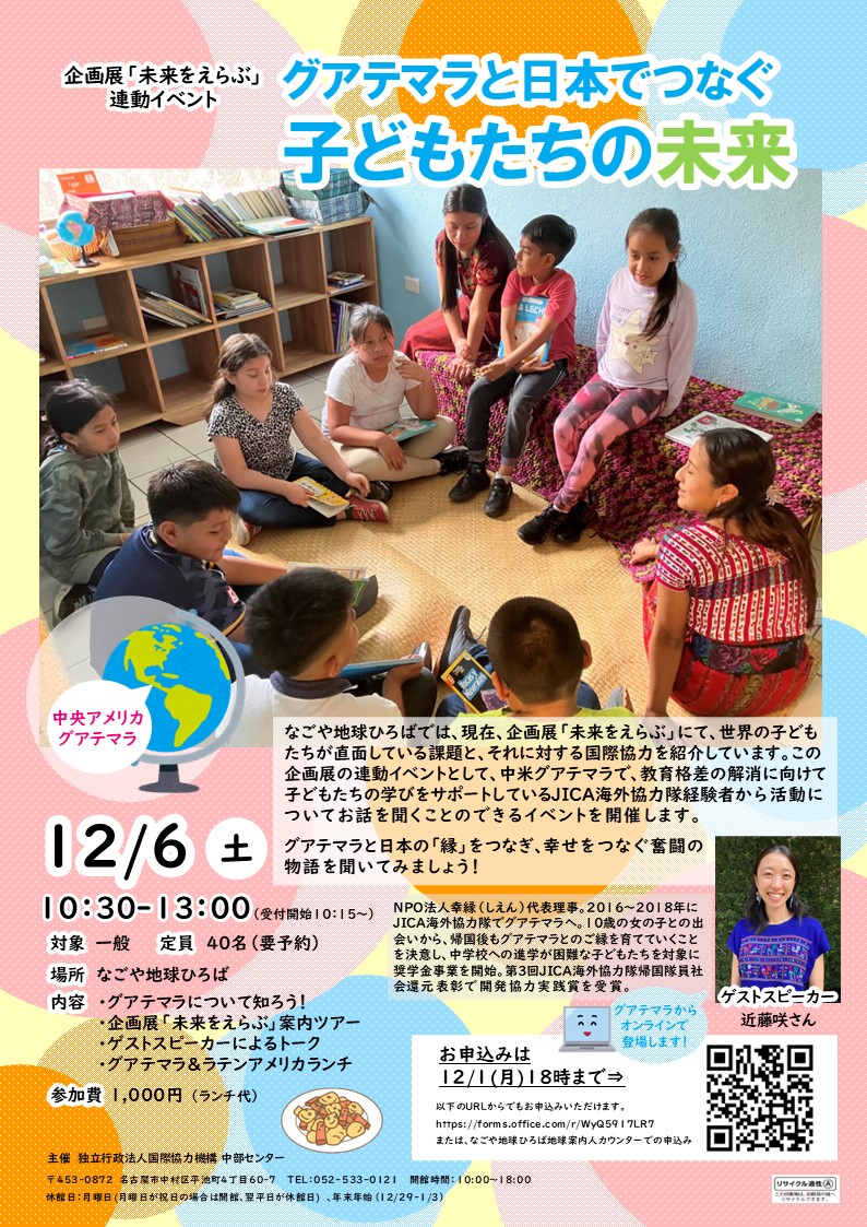 現在、なごや地球ひろばで開催中の企画展「未来をえらぶ」では、世界の子どもたちが直面している課題と、それに対する国際協力を紹介しています。この企画展の連動イベントとして、教育格差の解消に向けて子どもたちの学びをサポートしているJICA海外協力隊経験者から、中米グアテマラでの活動についてお話を聞くことのできるイベントを開催します。